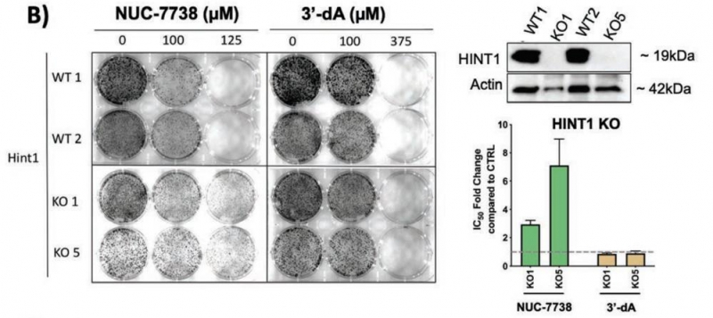 为了鉴定失活后对3'-dA和NUC-7738产生抗性的基因,研究团队使用近单倍体人类细胞系HAP1进行了插入突变筛查。结果显示,ADK中的插入物在3'-dA处理的细胞中强烈富集。在HAP1细胞系和单细胞来源的克隆HINT1敲除细胞中,CRISPR/Cas9对HINT1的敲除显著降低了对NUC-7738的敏感性,但不降低对3'-dA的敏感性。